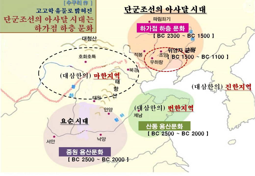 3) 단군왕검의 평양 아사달 위치는 고고학 관점에서 하가점 하층 문화(BC 2300 ~ BC 1600) 유적