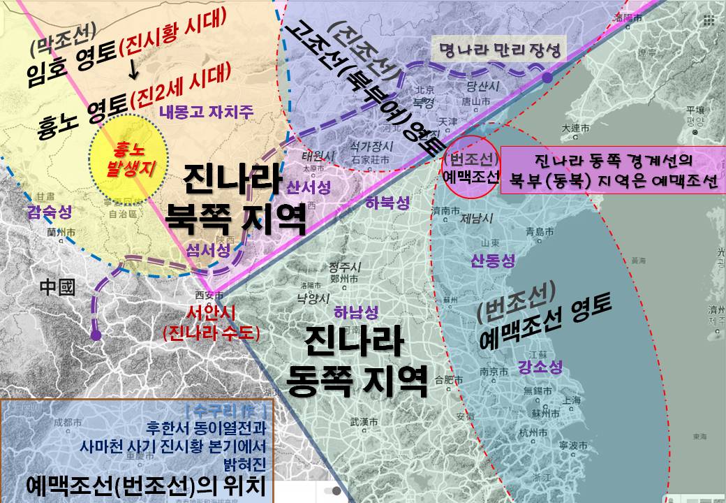 진시황의 진나라 시대에는 하북성 동부지역, 산동성, 강소성은 예맥조선의 강역으로 추정할 수 있다