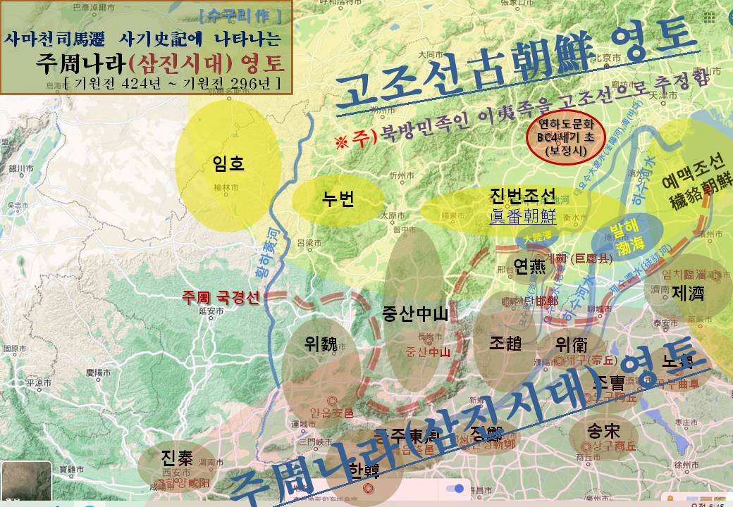 3) 고조선이 연燕나라 장수 진개에게 하북성 중부 땅을 빼앗겼고(석가장시와 호타하 남쪽 지역)