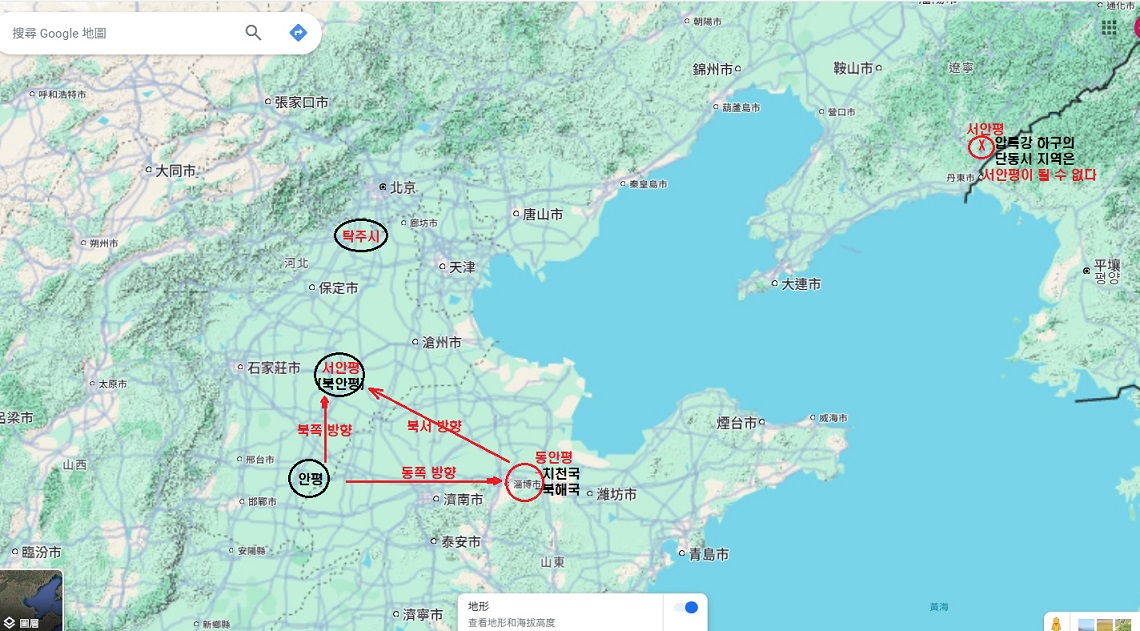 산동성 북동부 북서쪽인 하북성 중북부에 서안평(=북안평) 이 있어야 한다