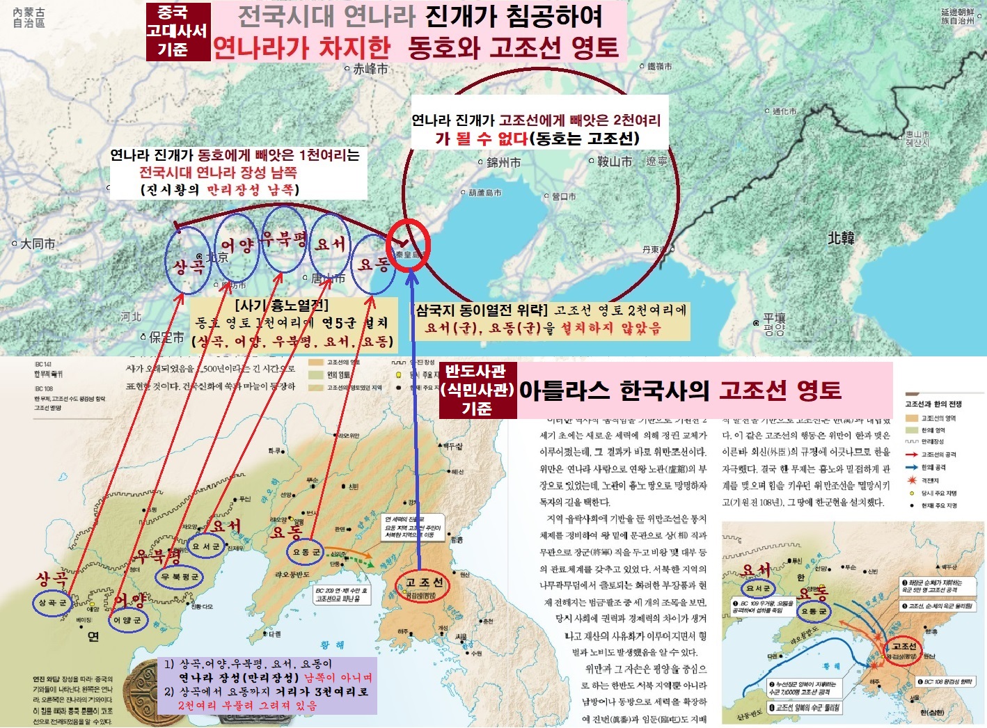 고조선 서쪽 2천리에 상곡군,어양군, 우북평군, 요서군, 요동군을 설치한 내용이 없다)