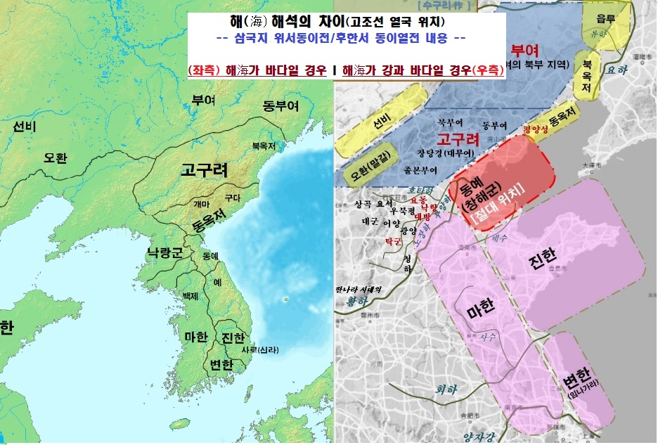 첫째는) 해海를 바다로 해석하여 삼한을 한반도 남부, 낙랑군을 대동강 평양,