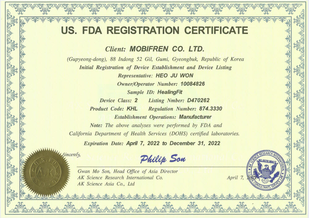 <모비프렌 힐링핏 미국 FDA 의료기기 등록증>